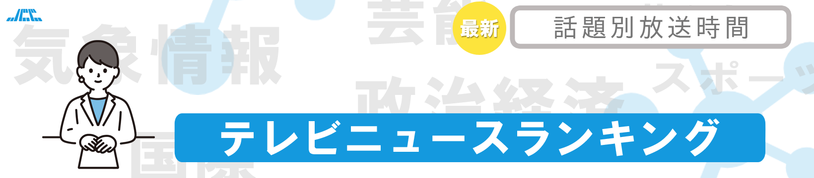 JCCでは毎日発生する膨大なニュースから同じ内容のものを自動的にひとまとめにするクラスタリング技術を開発し、全自動で毎日のニュースランキング一覧表をご提供しています。 テレビニューストピック別放送量ランキング(総合) objectタグに対応したブラウザでご覧ください テレビニューストピック別放送量ランキング(政治・国際) objectタグに対応したブラウザでご覧ください テレビニューストピック別放送量ランキング(スポーツ) objectタグに対応したブラウザでご覧ください テレビニューストピック別放送量ランキング(文化・芸能) objectタグに対応したブラウザでご覧ください テレビニューストピック別放送量ランキング(ビジネス) objectタグに対応したブラウザでご覧ください