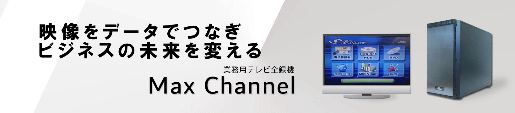 企業・団体の皆様のテレビ放送チェックニーズに応えた業務用自動録画機「Max Channel」。特許取得の便利な独自技術が搭載された業務用の全録テレビレコーダーです。1台で標準6チャンネル、最大8チャンネルまで同時に録画し、3週間分の放送を保存できます。