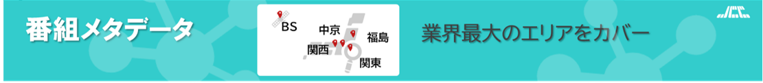 JCCでは映像メディアのテレビ放送をテキストデータとしてデータベース化。番組メタデータとCMメタデータを提供しています。番組メタデータは業界最大のエリアをカバー(関東・関西・中京・福島・BS)。