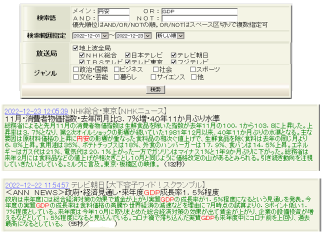 過去番組表や、キーワードでニュース・報道や情報番組などの記事を検索する。 |