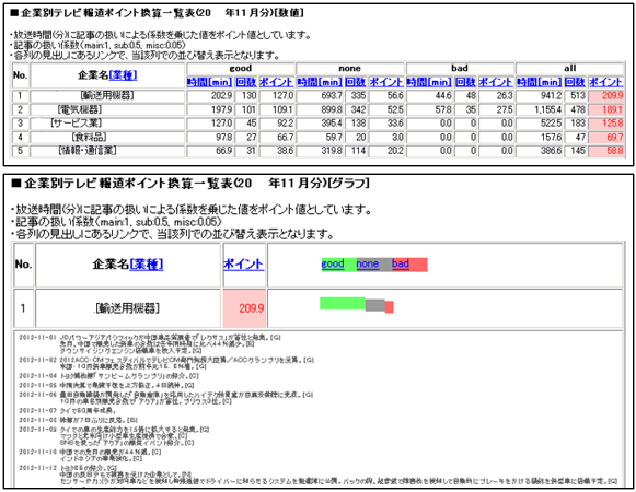 国内上場会社のテレビ露出に対してGood、Bad等の評価、扱いの大きさで分類し、ポイント・広告換算をレポートするサービスです。